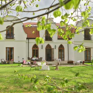 Wypoczynek w dworskim parku, do dyspozycji meble i leżaki ogrodowe