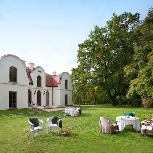 Wypoczynek w dworskim parku, do dyspozycji meble i leżaki ogrodowe